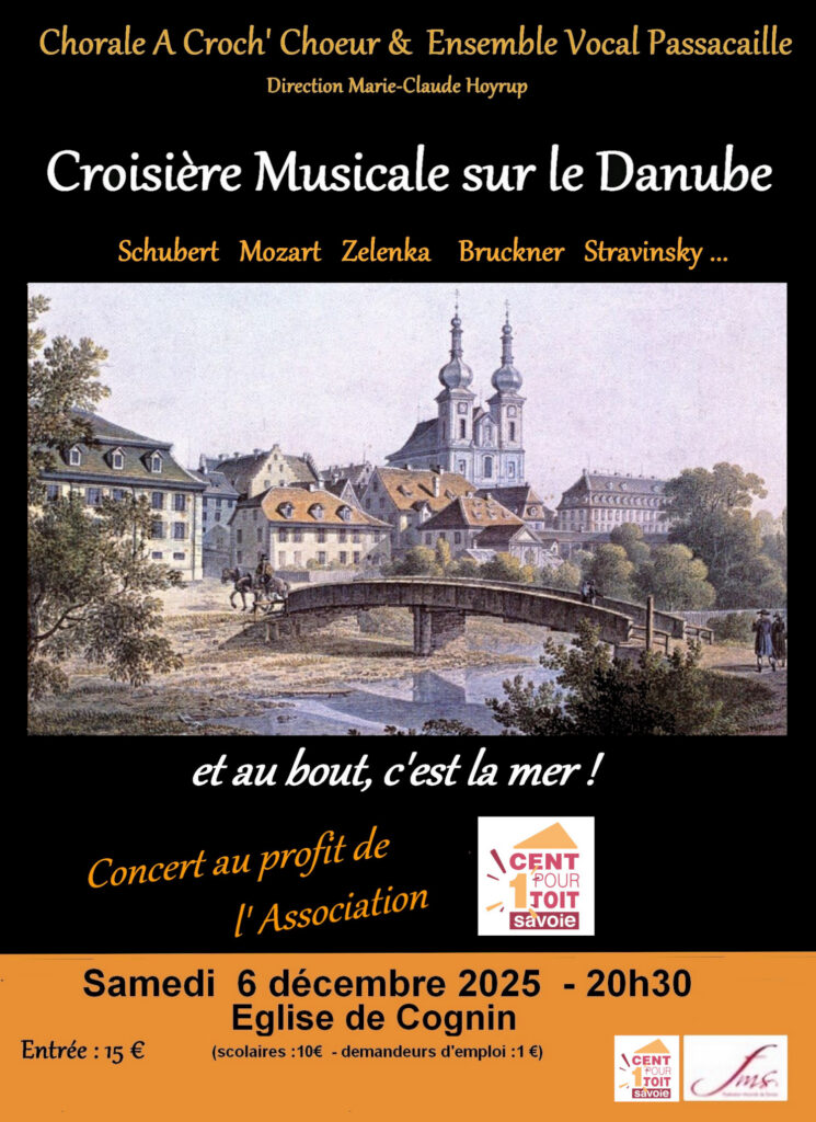 Les choristes des chorales «A Croch’Chœur» et «l’Ensemble Vocal Passacaille» et leur chef Marie-Claude Hoyrup, vous invitent le 6 décembre à 20h30 à l’église de Cognin pour une croisière musicale le long du Danube autour de Pièces sacrées ou profanes, de Liturgie orthodoxe et de Chansons traditionnelles, accompagnés par Clémence Hoyrup à l’orgue et Ludovic Le Touze au violoncelle.